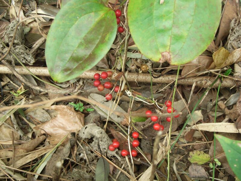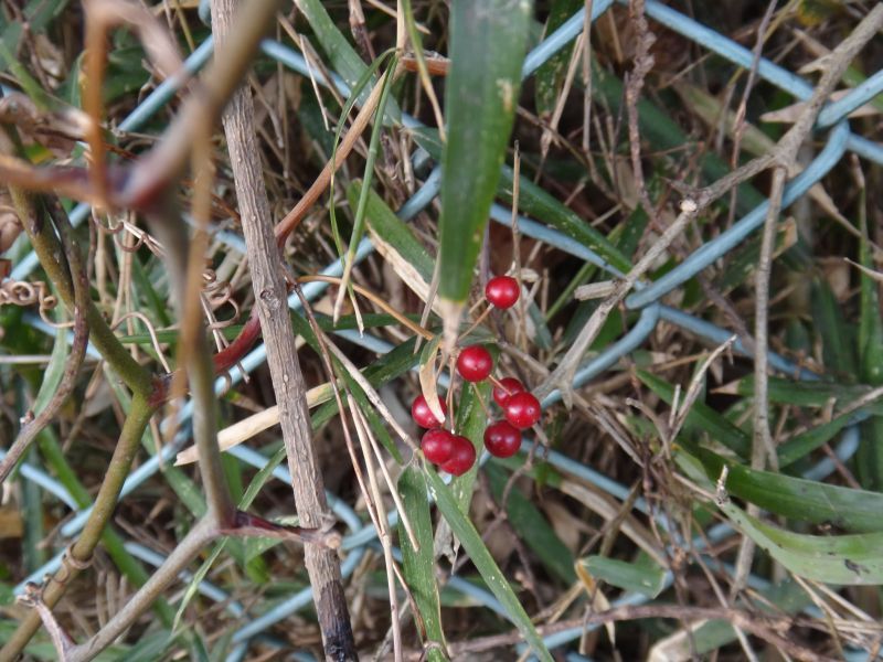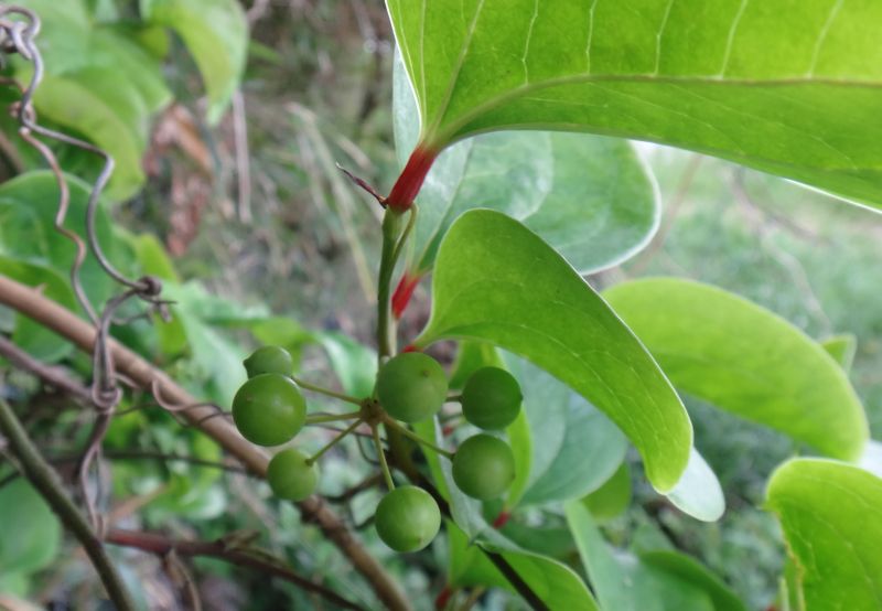 サルトリイバラ:葉に光沢があり葉脈が3〜5本、茎に棘。巻きひげ。赤熟。