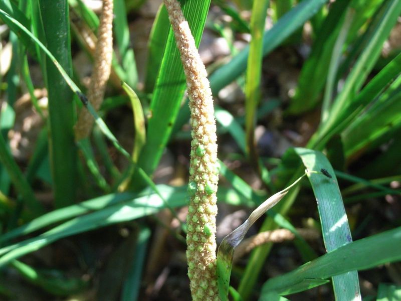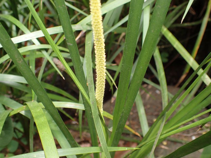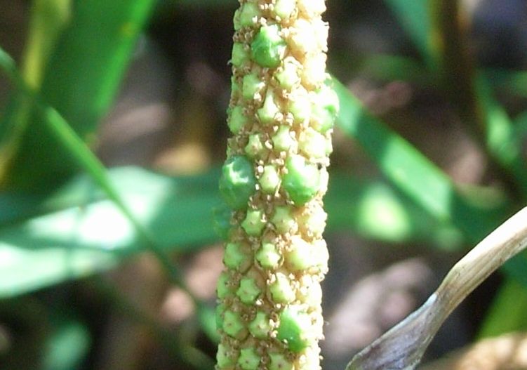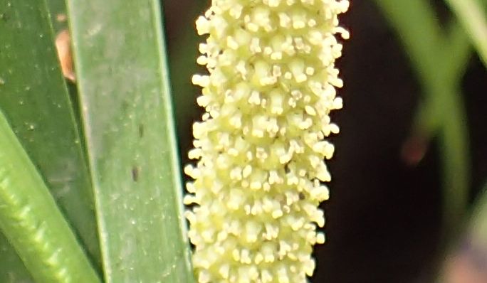 長さ5〜10センチの細長い黄白色の肉穂花序をだし、
