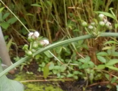 細い花径を長くのばし、白い4弁花を数個ずつ、間隔をおいてつける。