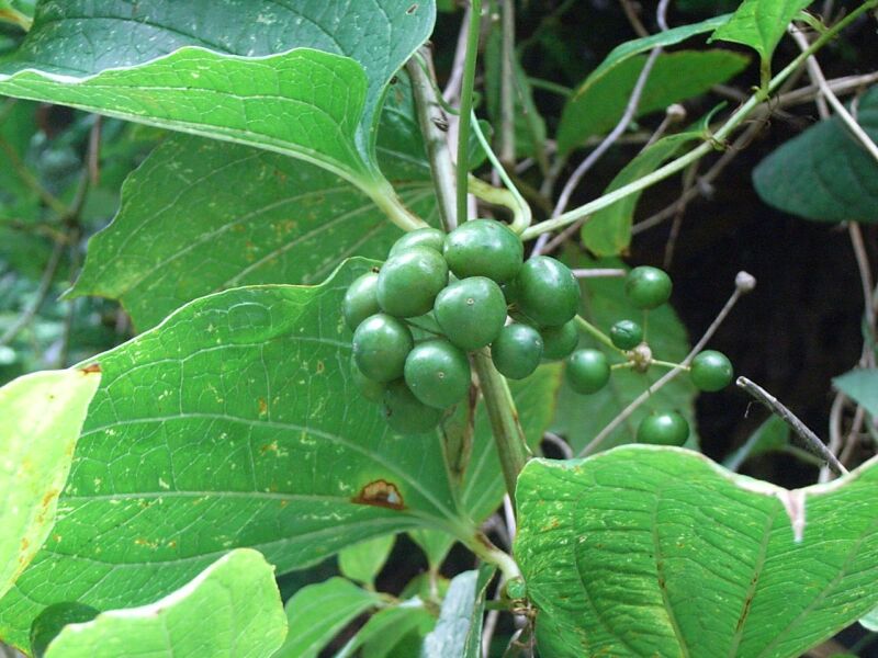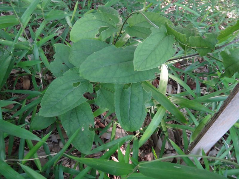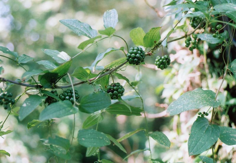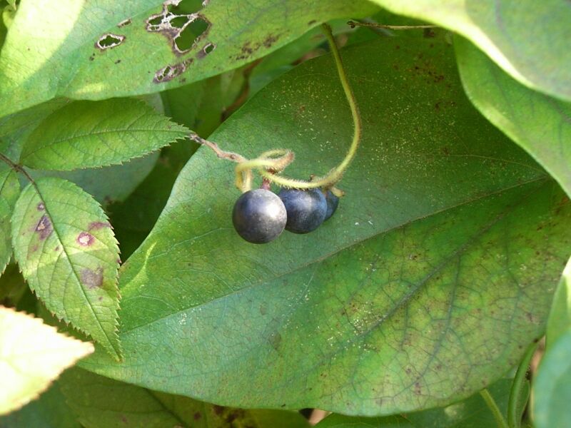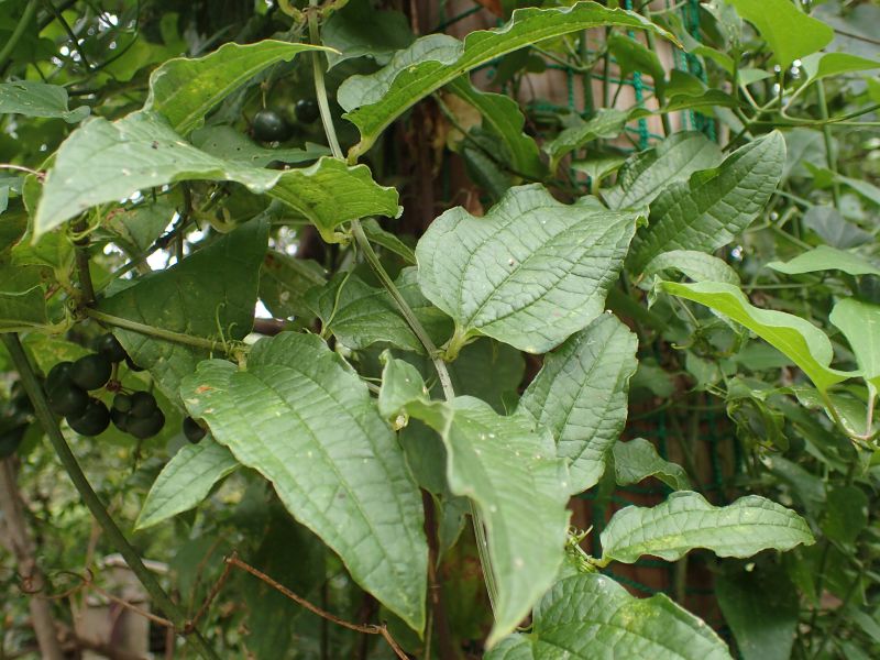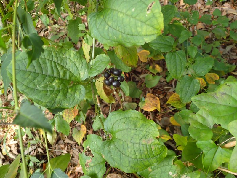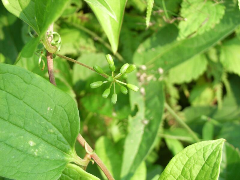 シオデ :葉の光沢は弱く、葉脈は5〜7本、棘なし、巻きひげ。黒熟。。