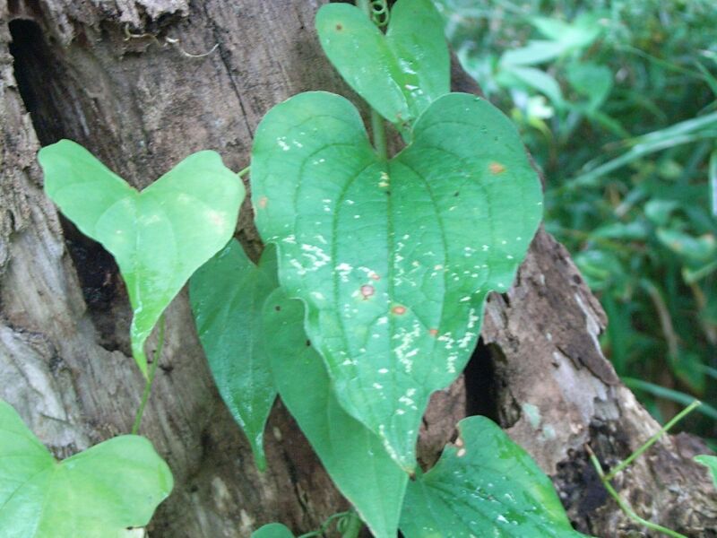 サルトリイバラ:葉に光沢があり葉脈が3〜5本、茎に棘。巻きひげ。赤熟。