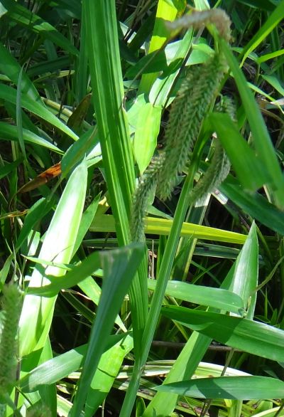 その下に雌性で長さ3〜6センチの円柱形で緑色の側小穂を数本つける。