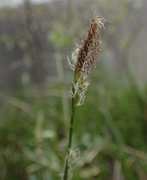 雄性の頂小穂は棒状で、雌性の側小穂には果胞が並ぶ。(2013/5/3)