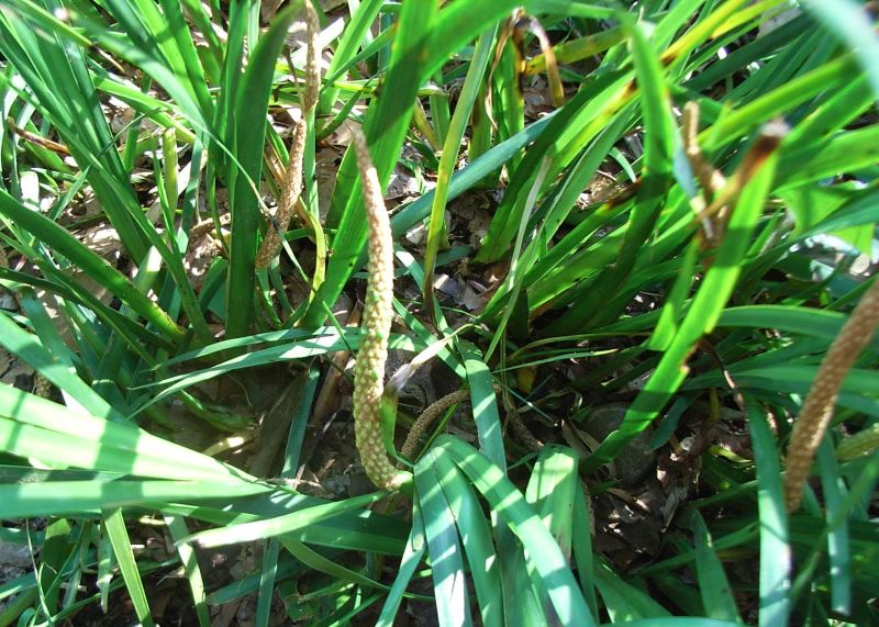 葉は剣形で、葉に似た花径から淡褐色の肉穂花序を出し、 その上に葉に似た苞がつく