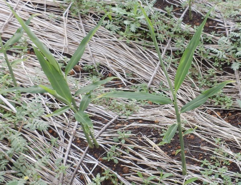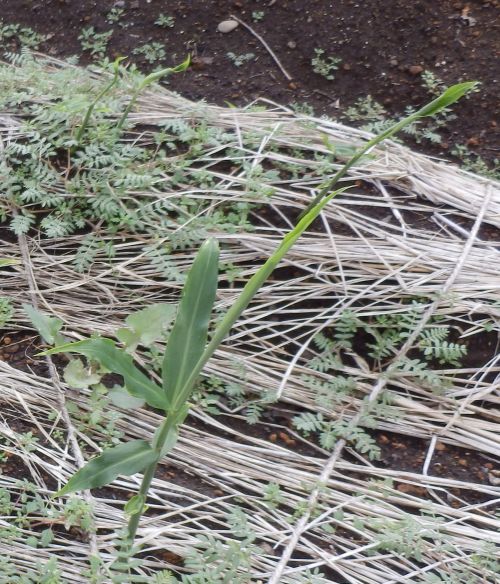 葉柄が多重に巻いた偽茎が立ち上がり、細長い葉が互生状に出る。(2015/7/2)