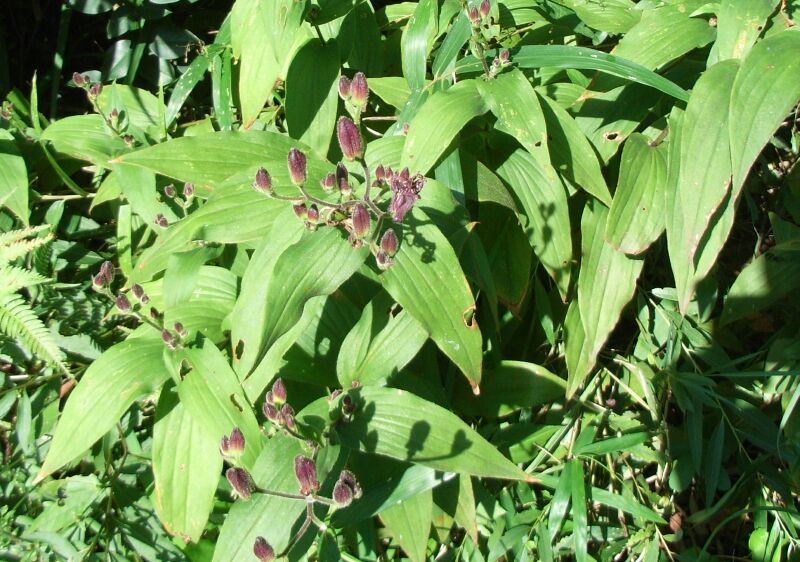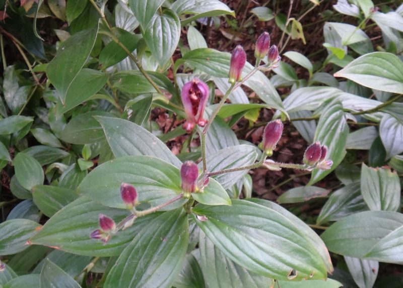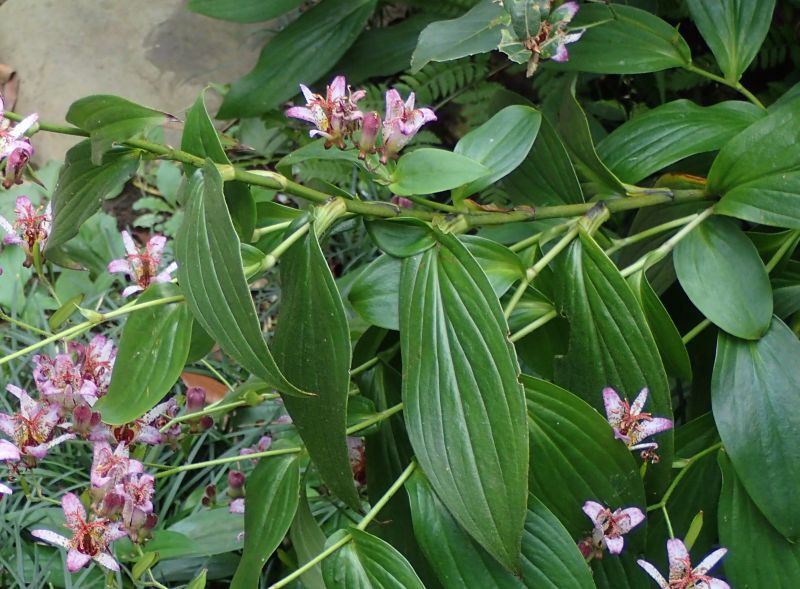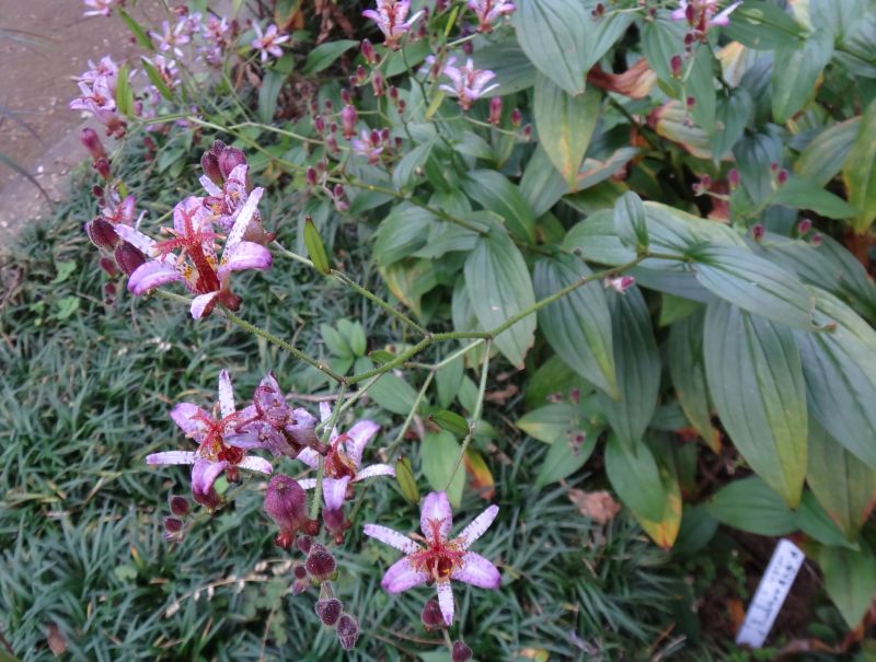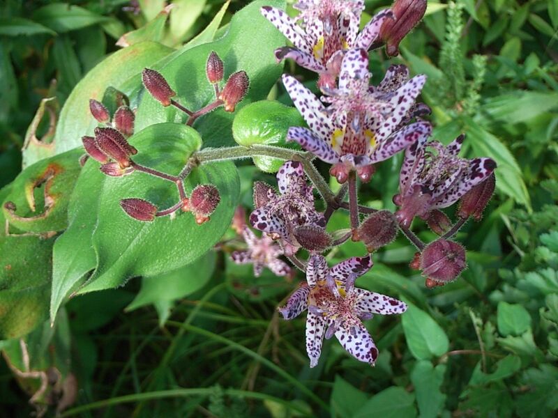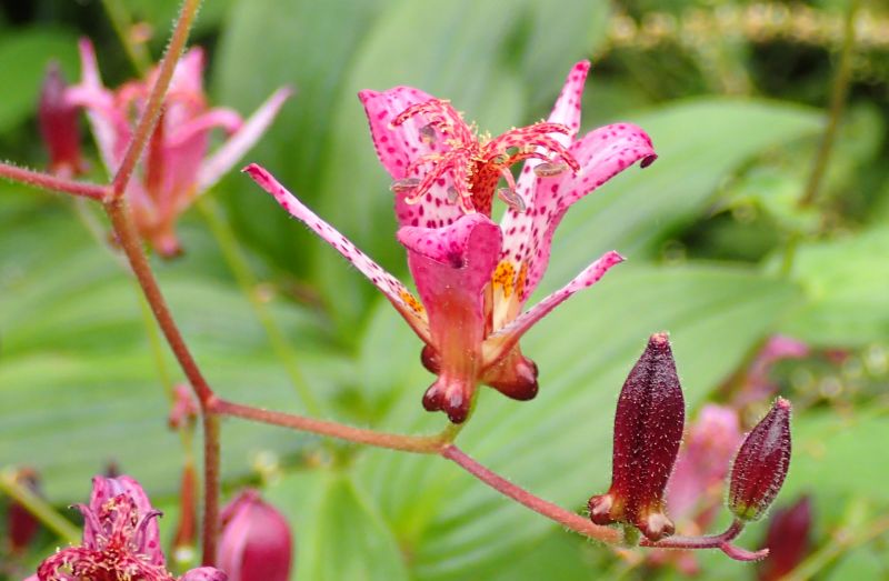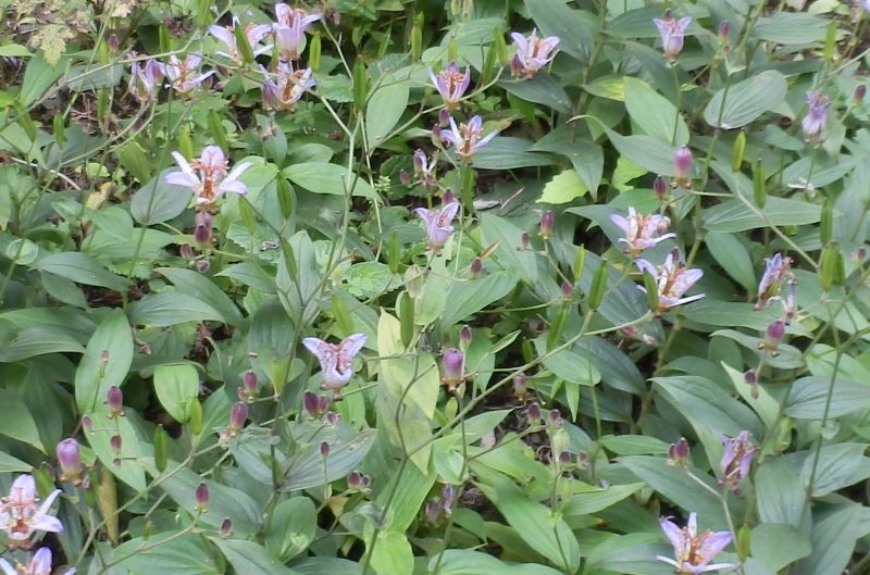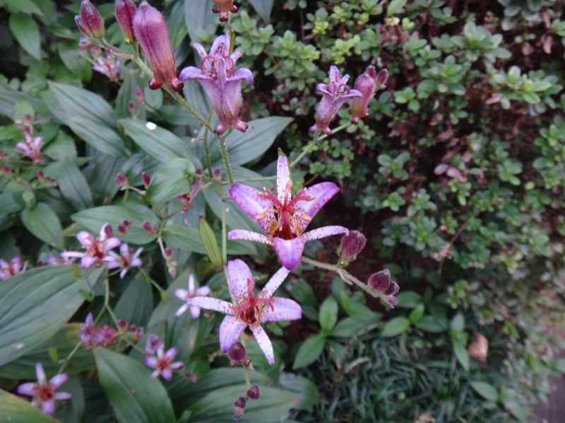タイワンホトトギス:花被片斜上、紅紫色斑点多数。茎先に散房状に咲く。