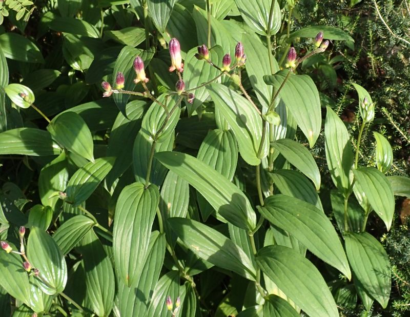 花は茎先に散房状に咲き、紅紫色の斑点のある花被片が斜め上を向き、