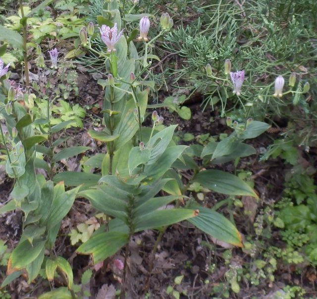 ヤマジノホトトギス:花被片上半部平開、紅紫色斑点やや少ない。茎先や葉腋に1〜3個ずつ咲く。