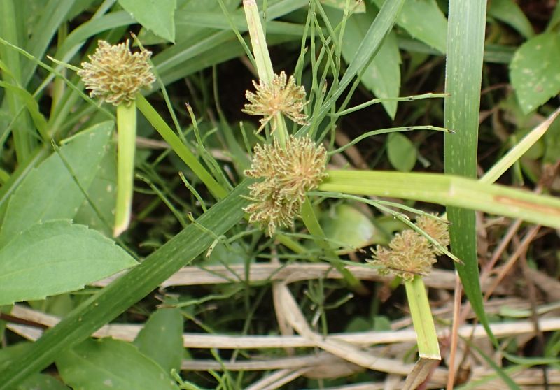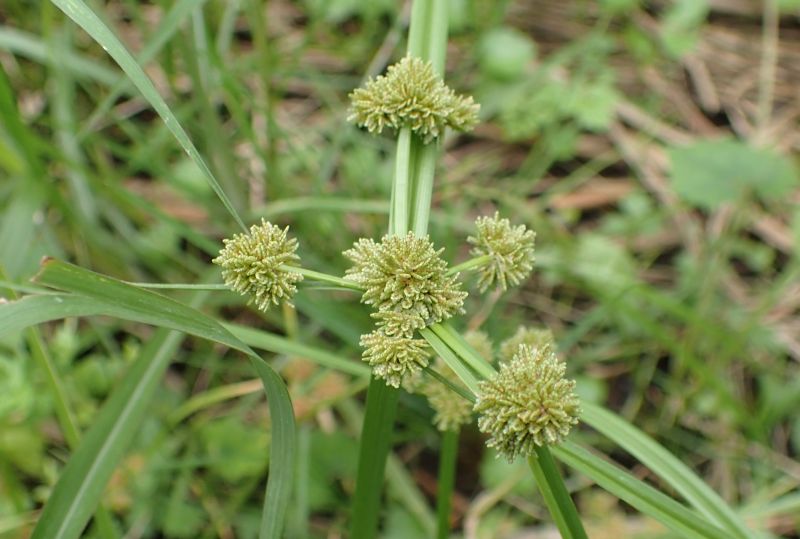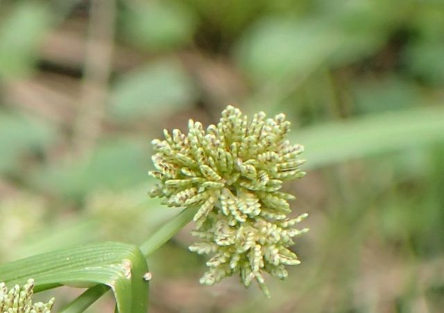 褐色を帯びた小穂が球形に集まった直径約1センチの花穂をつける。