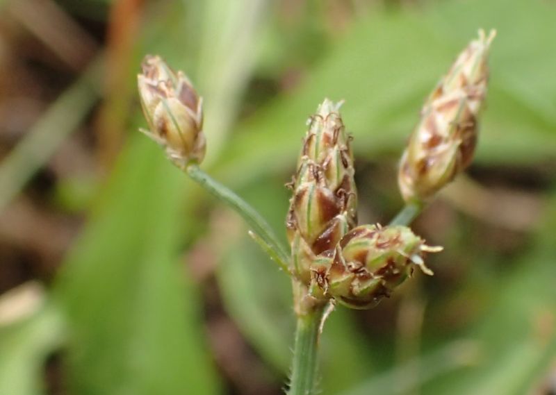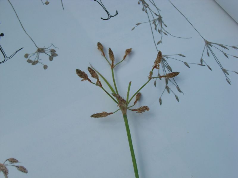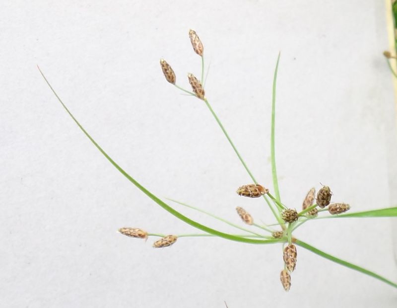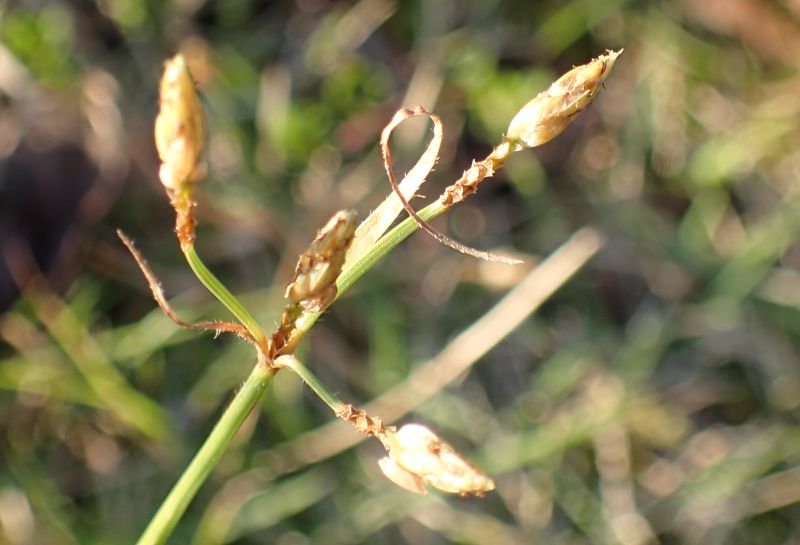 メアゼテンツキ:高さ5〜20センチ、茎先の複散形花序に黄褐色の小穂、短い芒あり。