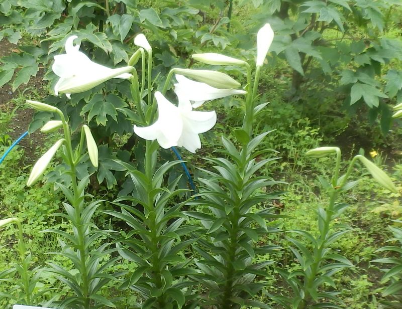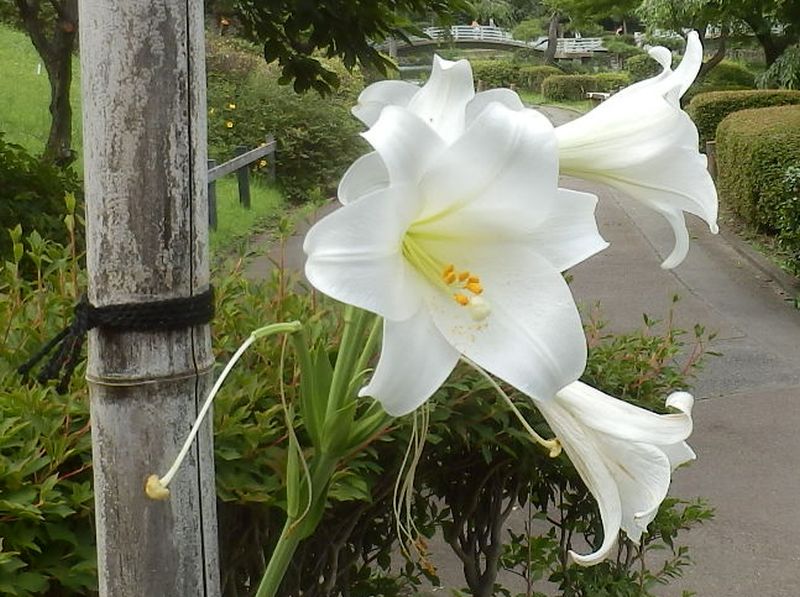テッポウユリ:葉が幅広、花は細長で白く、少し反り返り、春咲き、刮ハ長楕円形。