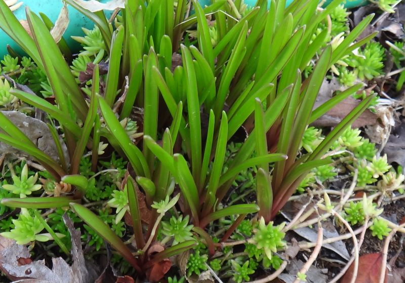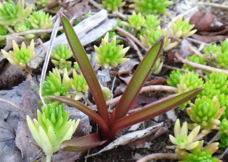 早春の葉。線形で、断面はU字形。基部に赤みがある。
