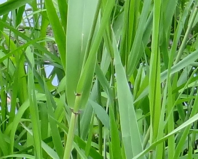 アシ :湿地、丈1.5〜3米、根茎地中を走り、疎に群生、葉は幅広で斜上、中脈目立たず、葉鞘は薄緑、。