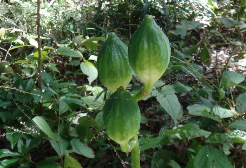 未熟な果実は、緑色の楕円形で、両端が少し尖る。