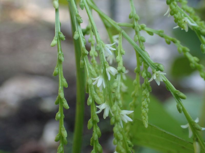 雌雄異株で、葉腋から垂れ下がる穂状花序に、