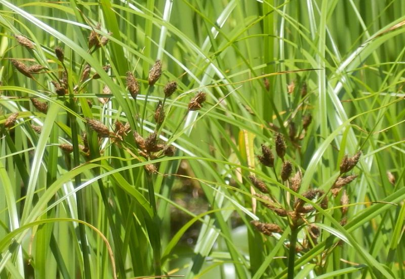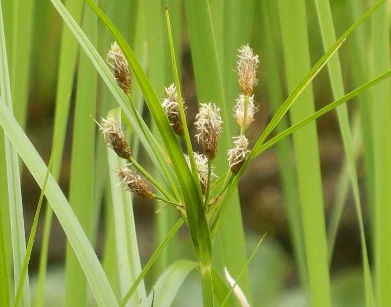 花序枝の先に長楕円形で褐色の小穂を1〜4個つける。