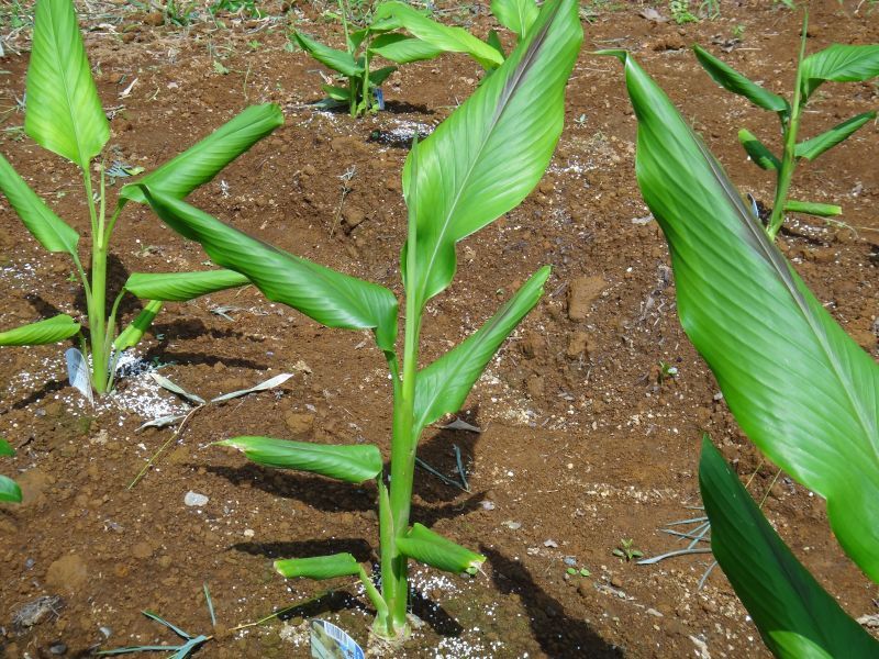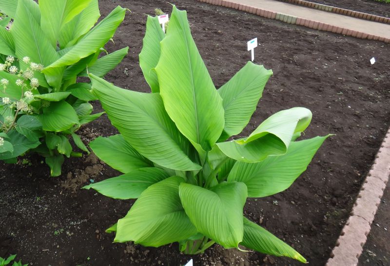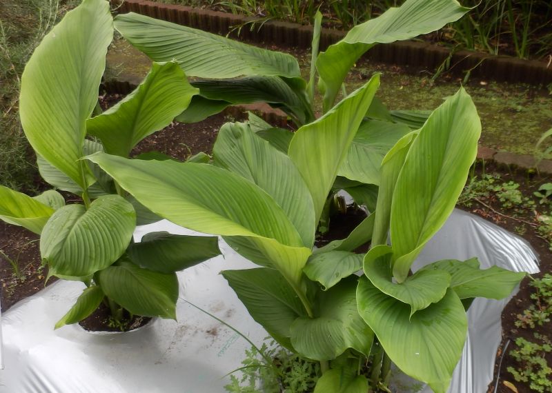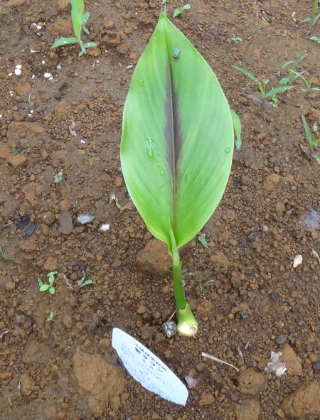 秋ウコン。葉は先のとがった楕円形で、脈が明瞭。(2016/7/28)
