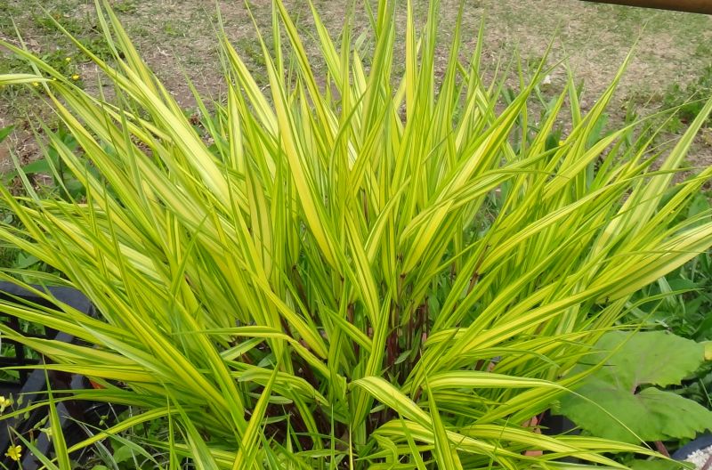 基部は赤みを帯びる。これは葉に黄色い縞のある品種。