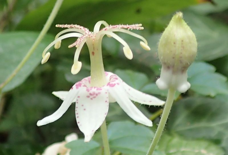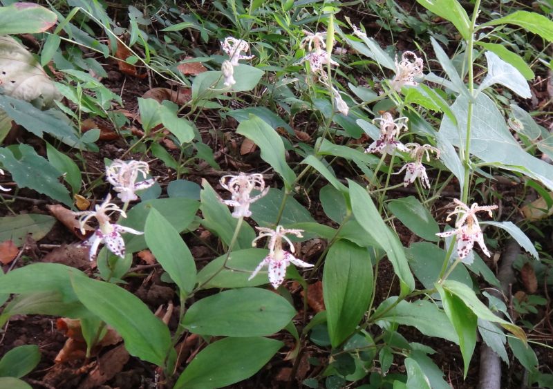 タイワンホトトギス:花被片斜上、紅紫色斑点多数。茎先に散房状に咲く。