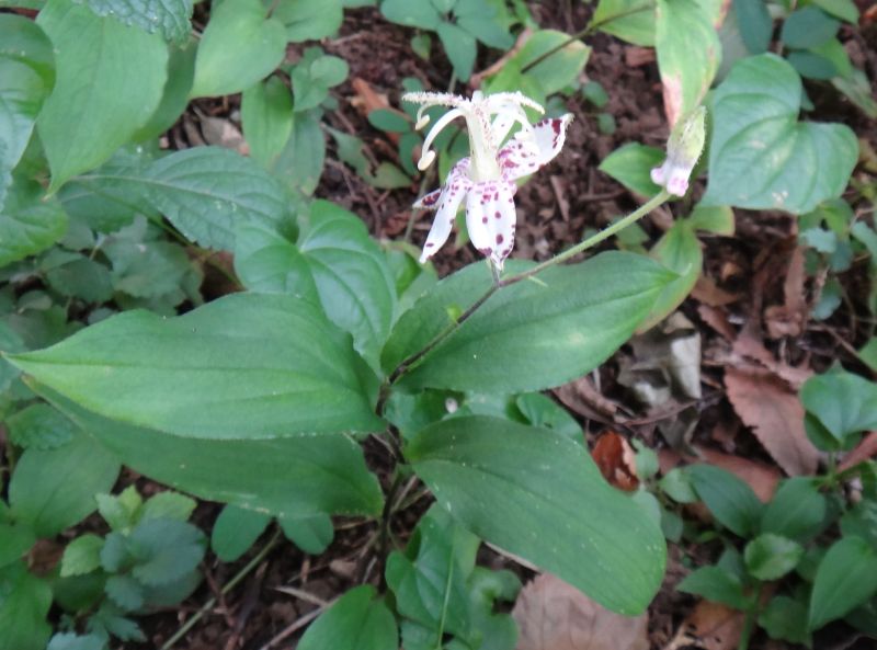 ヤマジノホトトギス:花被片上半部平開、紅紫色斑点やや少ない。茎先や葉腋に1〜3個ずつ咲く。