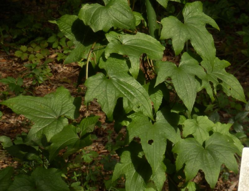 つる性で、葉はカエデの葉に似ており、中央裂片は先がとがるが、