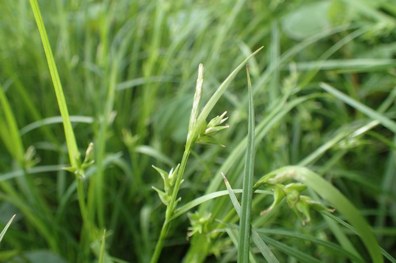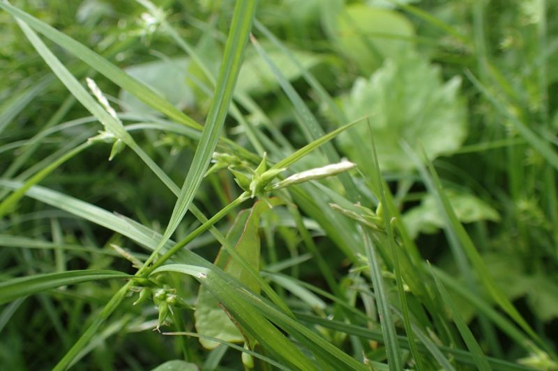 雌小穂には、葉状の長い苞があり、米粒状で嘴のある果苞が穂状に並ぶ。